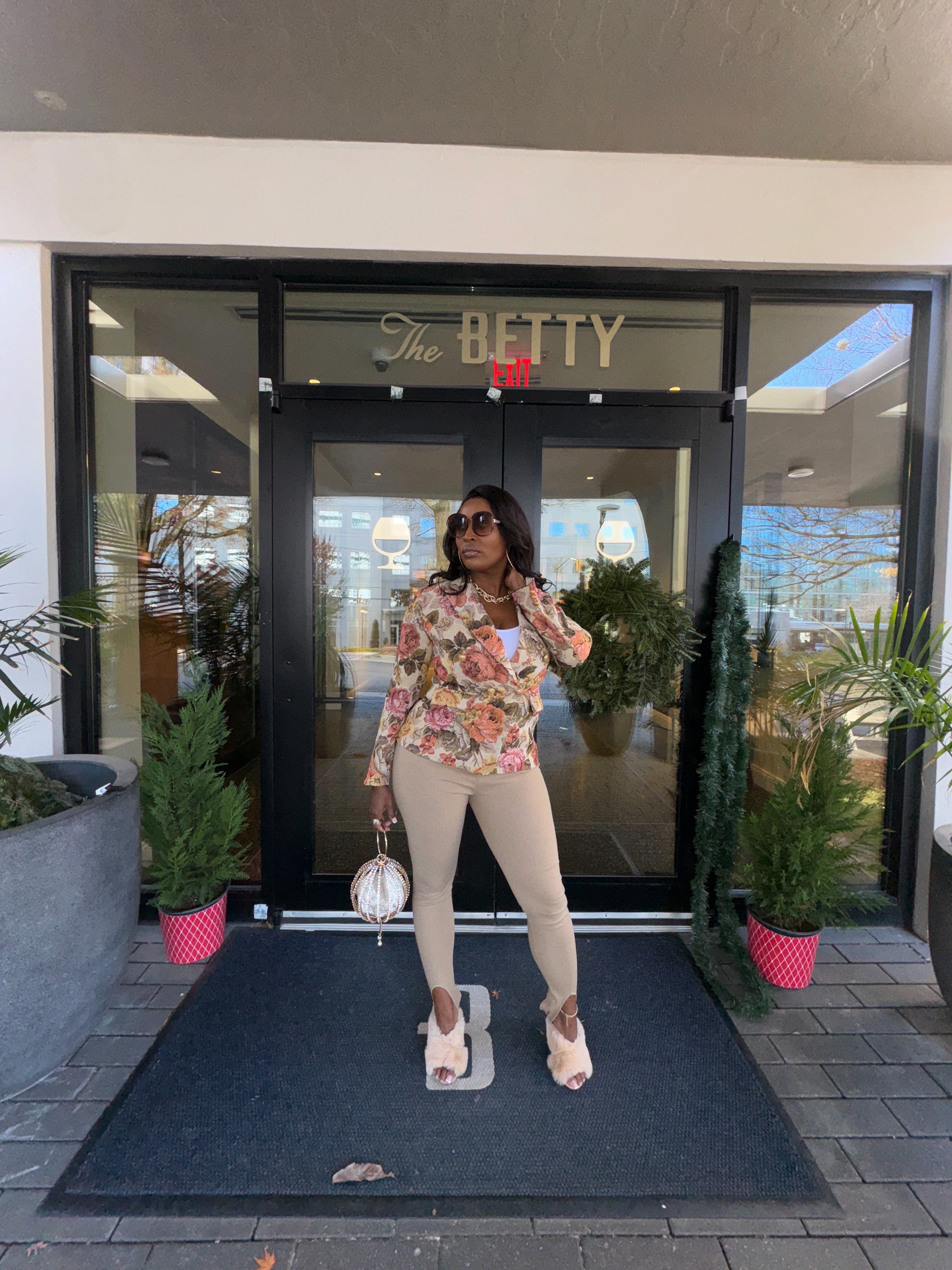 This nostalgic blazer is perfect to throw on and go! Featuring an inside button closure as well as 6 outside gold buttons, two front pockets, and a slim fitting design. Paired here with our ribbed knit leggings.