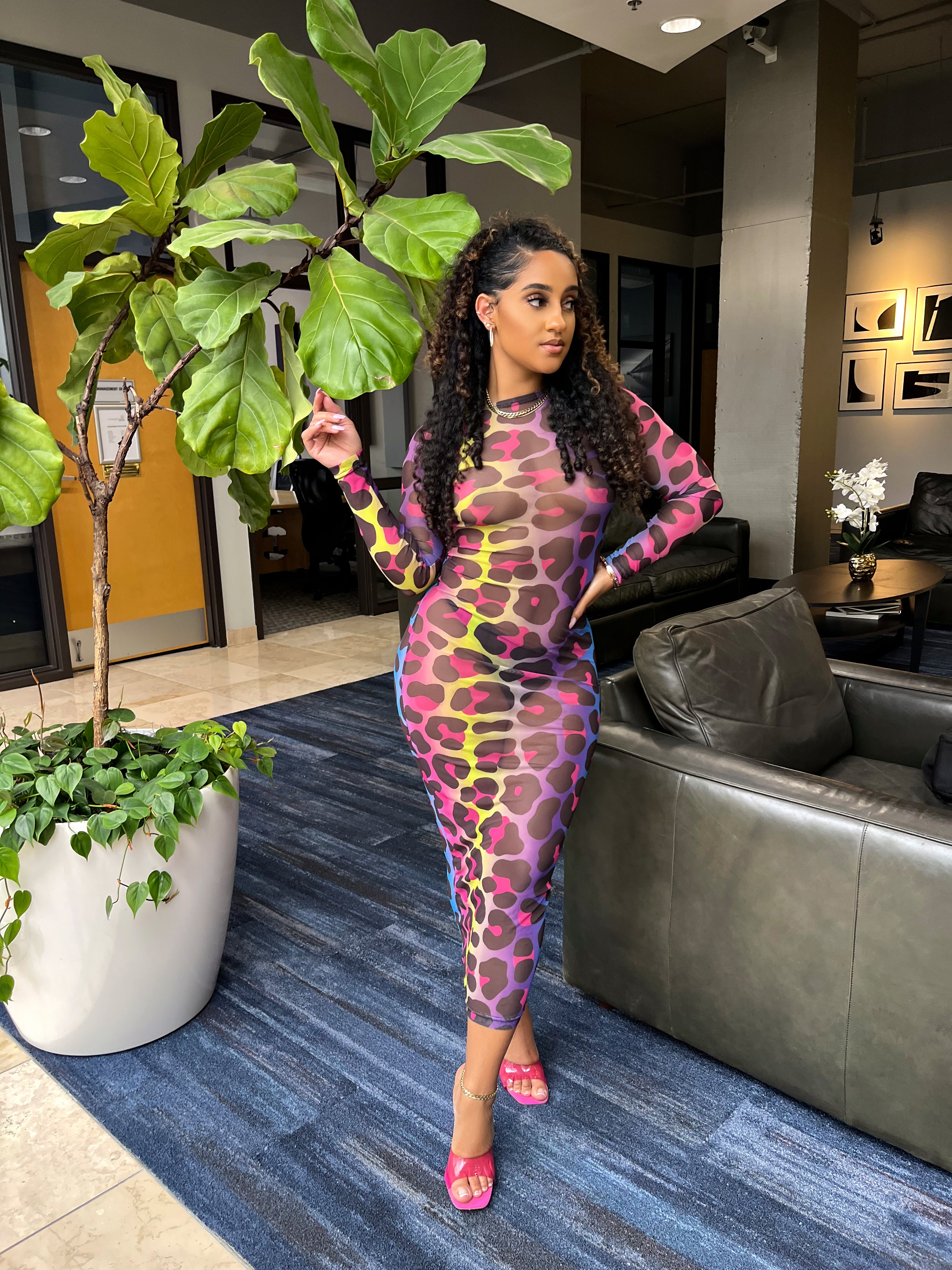 This sheer colorful cheetah print dress is sexy and chique at the same time! This dress is sheer throughout and does not come with a dress liner.
