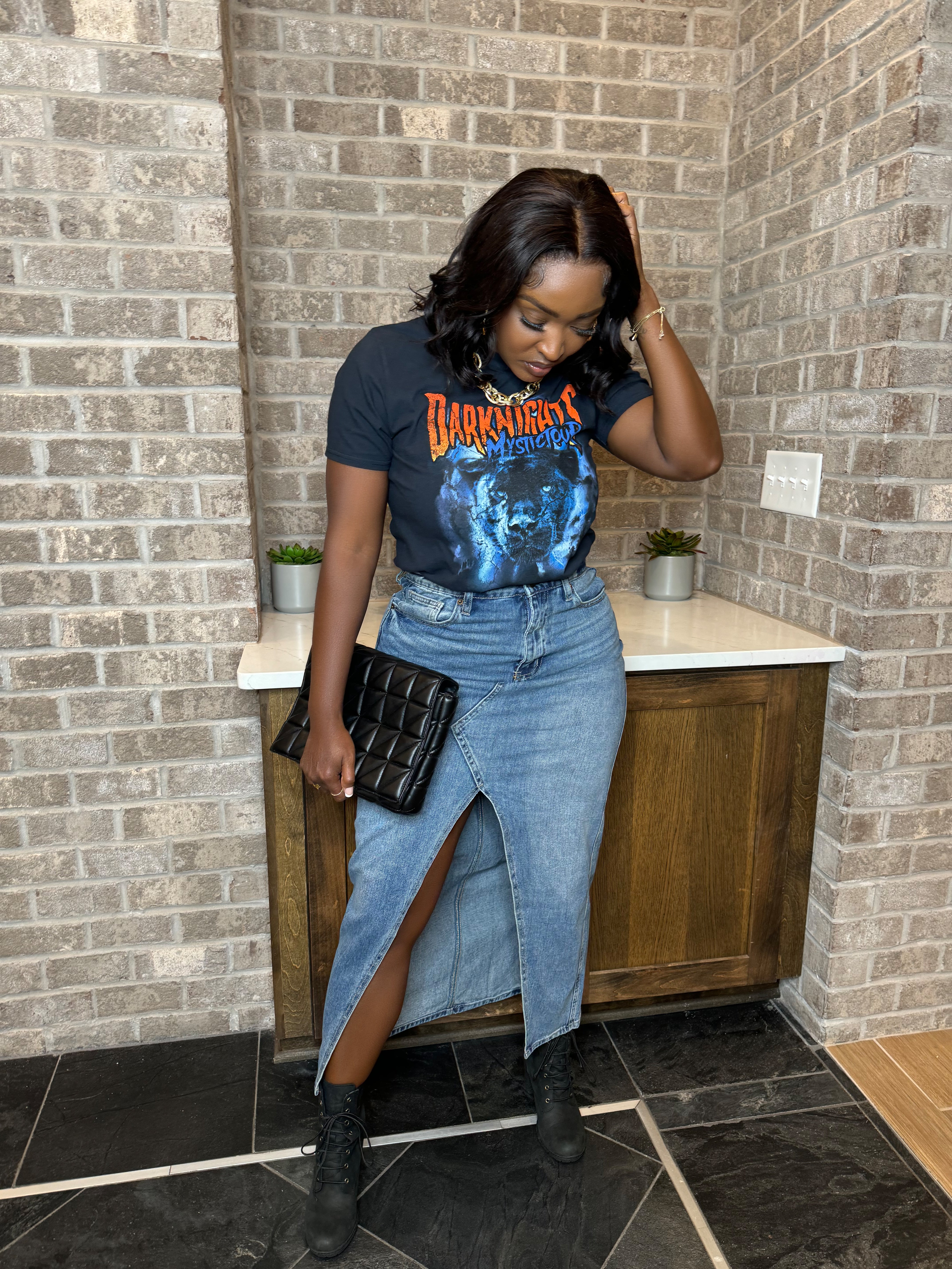 Our medium wash maxi skirt is the perfect versatile piece for fall. Featuring 5 pockets and a sexy front split.