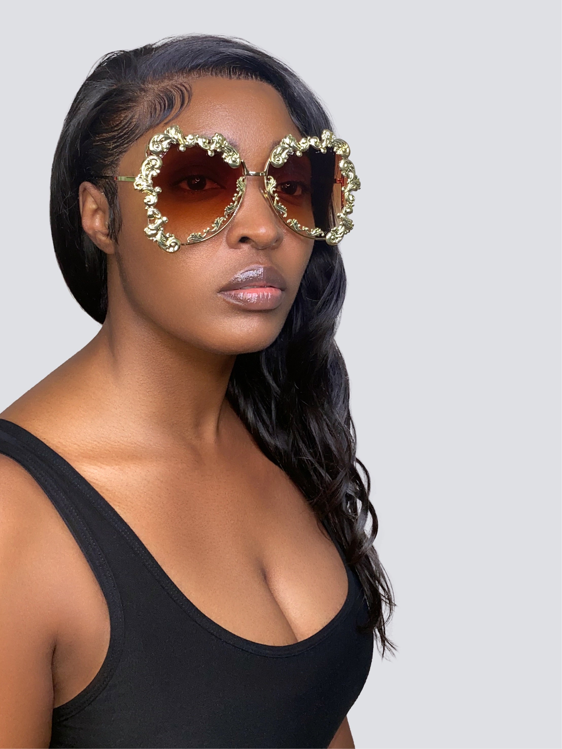 Dark brown colored oversized frame shades. Features an ornate gold design around the edges of the glasses.