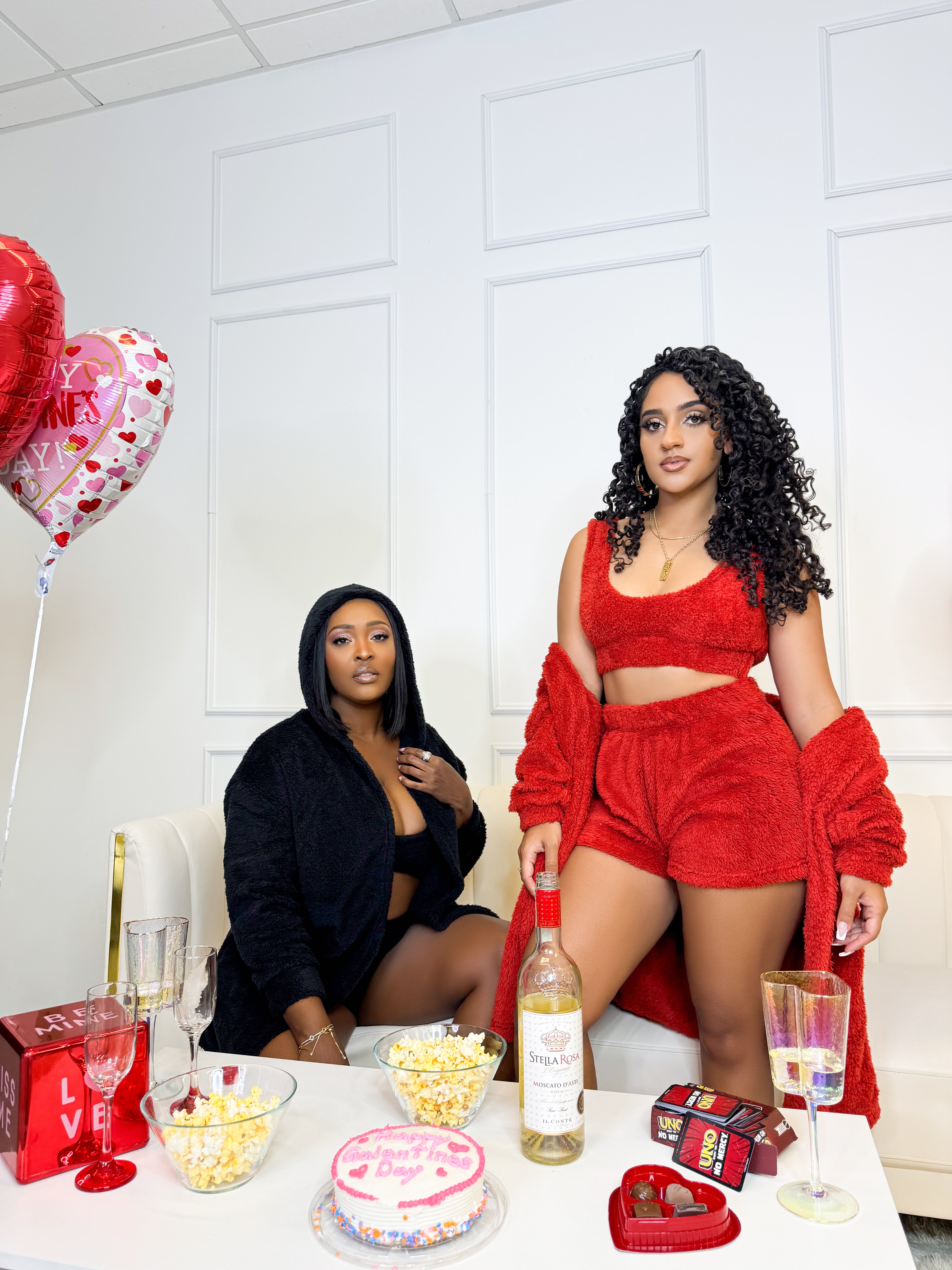This 3 piece set of coziness is made especially for the colder months while still keeping it cute! This set feels warm, soft and cozy against the skin with fleece material. The shorts feature an elastic waist band, the cardigan features a hood with pockets. Available in black and red. (Slippers not included)