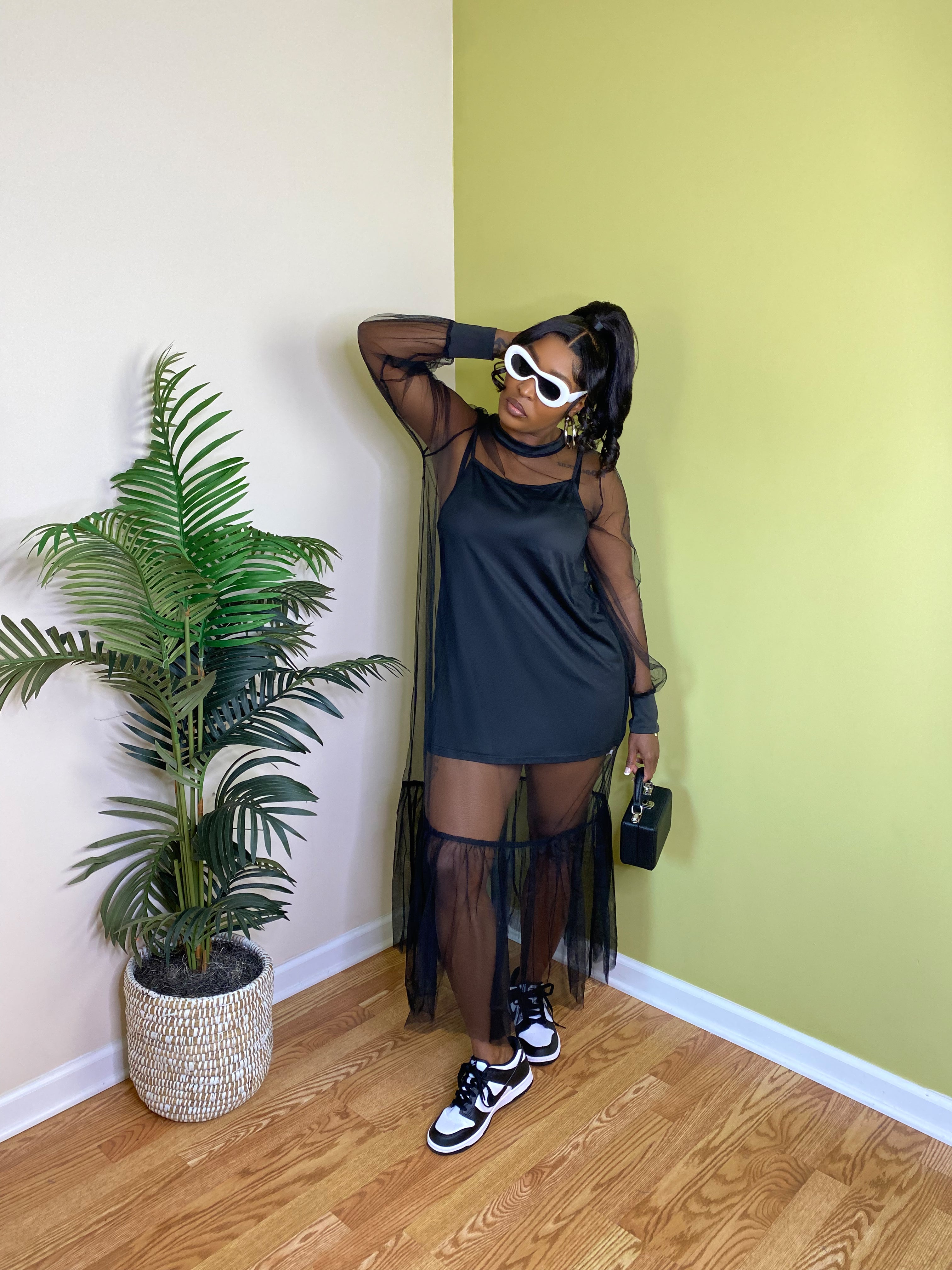 Full mesh long sleeve dress with solid under dress. Complete the look with our bubble glasses.