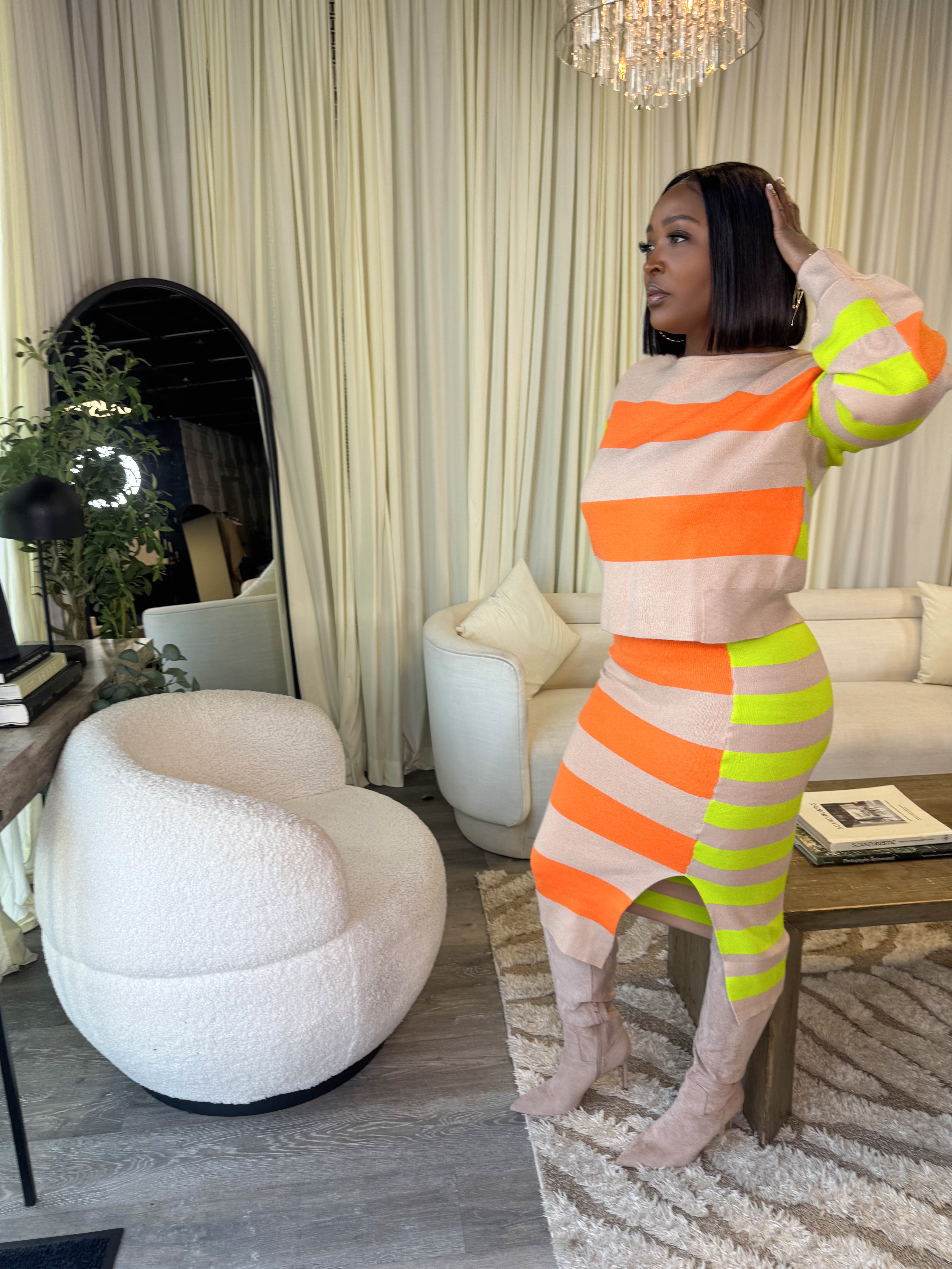 This skirt set is amazing from the colors to the stretch. This set is made with thick warm fabric which is perfect for cooler nights. Skirt has a side split to show a little skin.