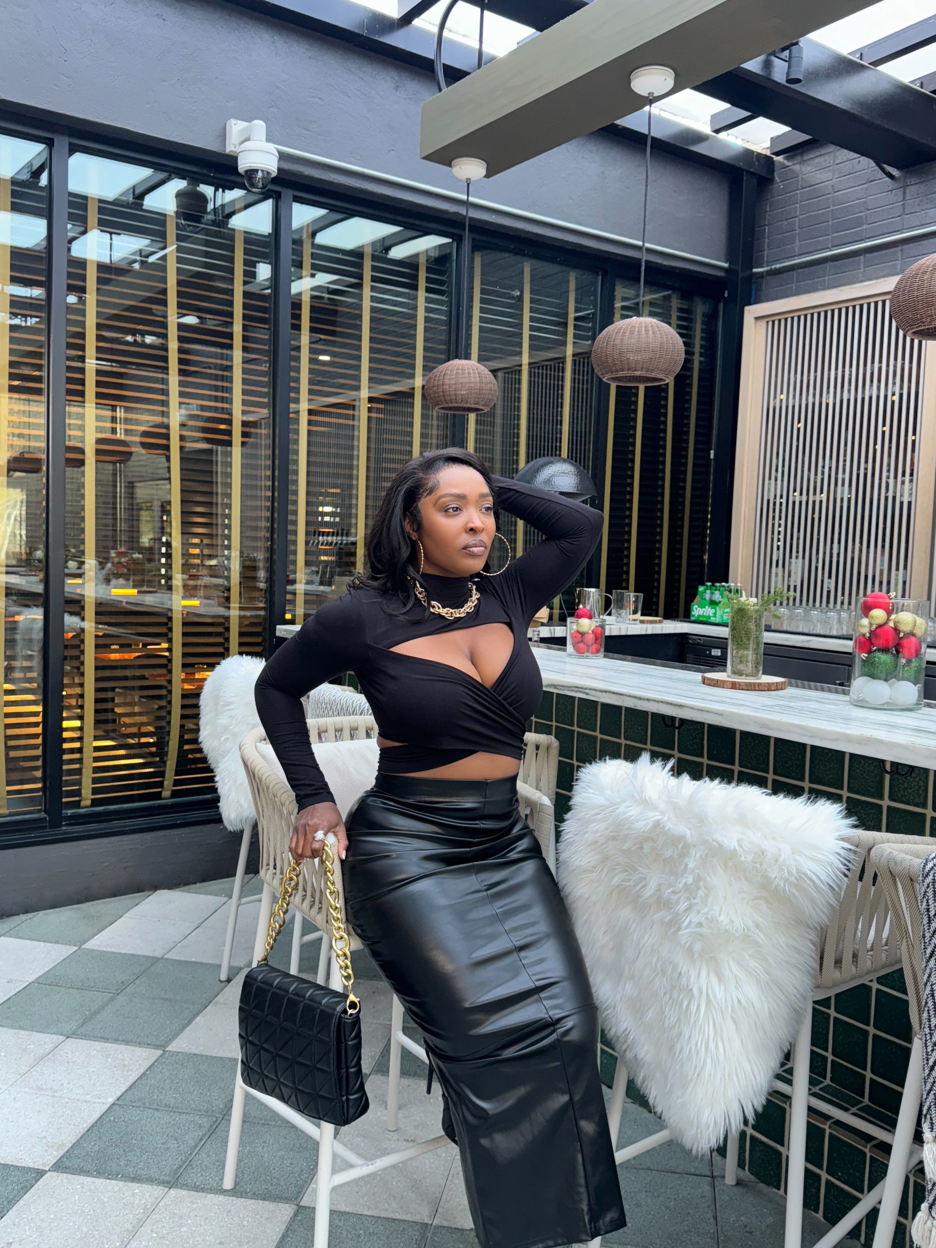 We love a versatile top! This long sleeve top can be wrapped to your liking. Worn here with our leather maxi skirt.