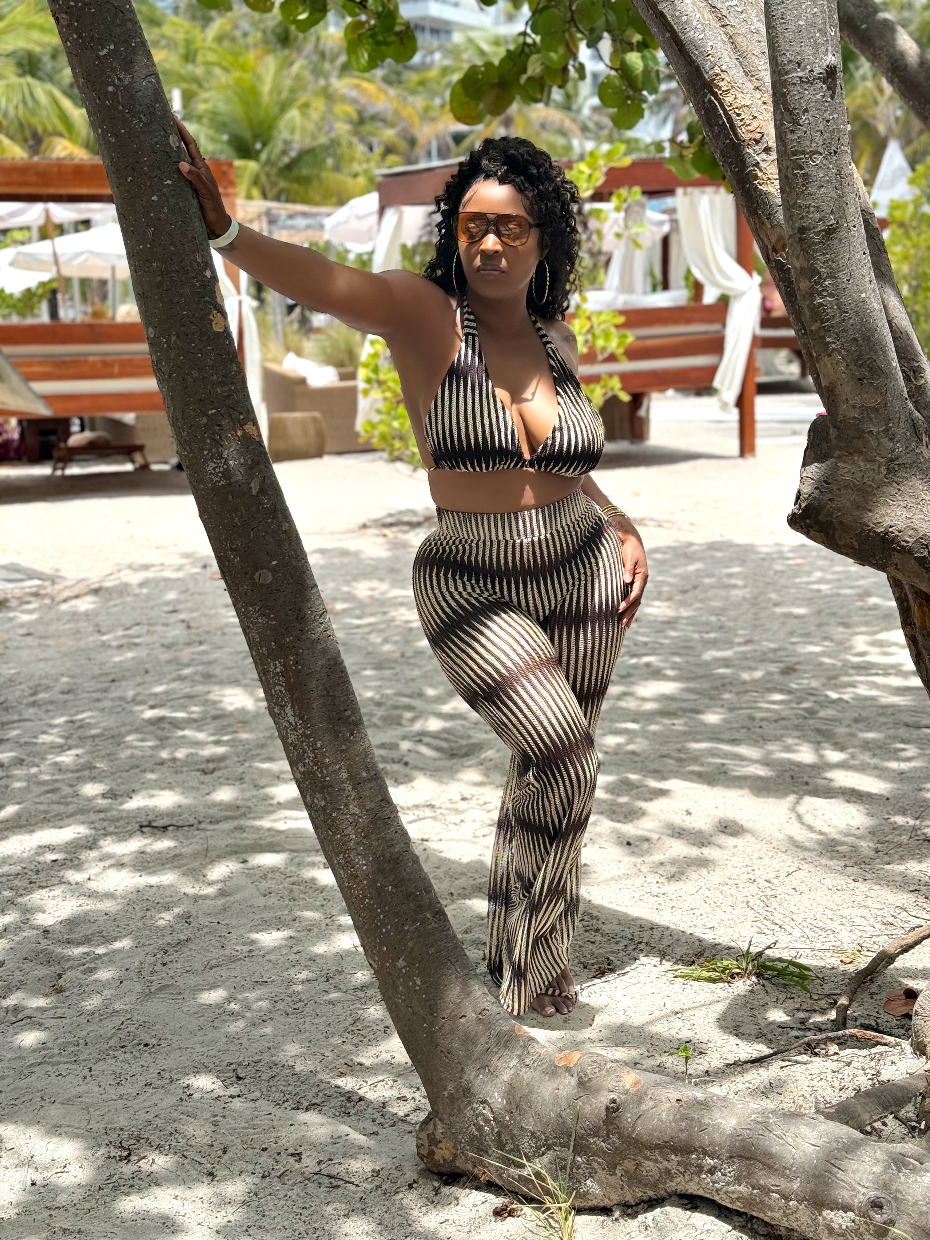 The perfect set for a day at the beach! Featuring a bralet style top, and elastic waist stretch pants.