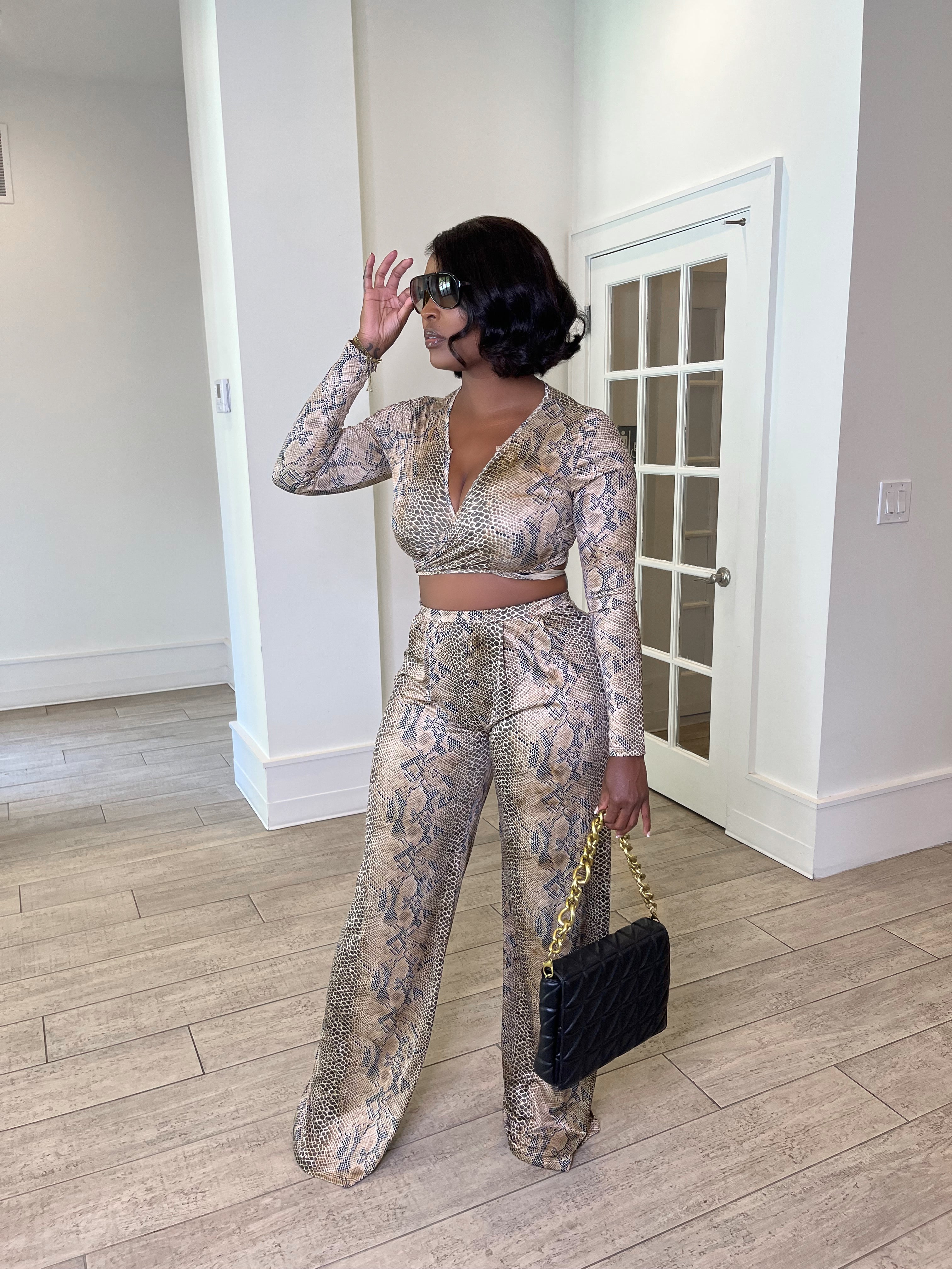 Snake print two piece set. Multi tie crop top and high waist palazzo pants